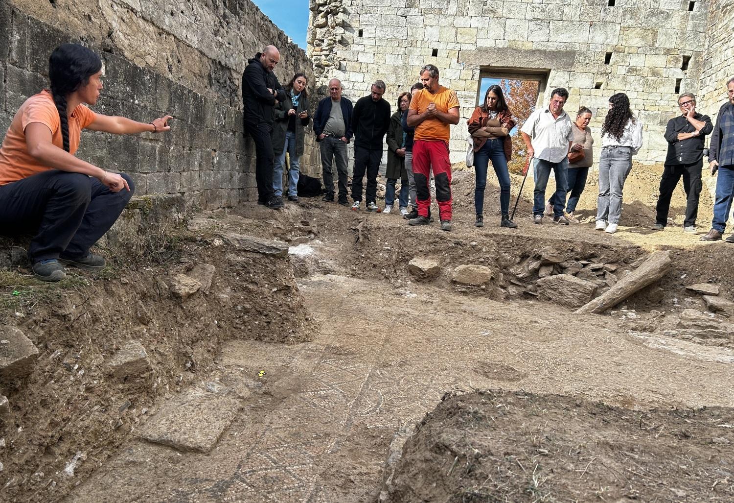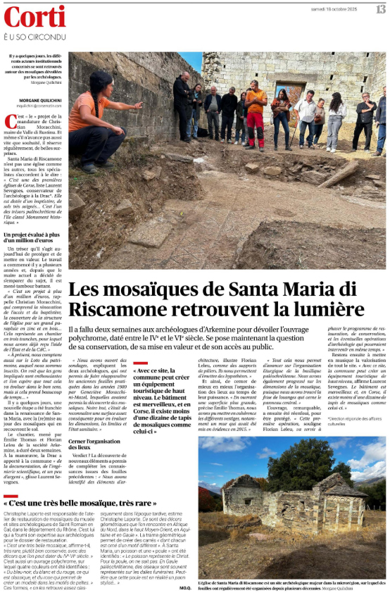 Dans le cadre de la restauration et de la valorisation patrimoniale du site de Santa Maria de Riscamone, l’entreprise ArkeMine a réalisé le 29 septembre 2025 la mise au jour du tapis de mosaïque situé à l’intérieur de l’église romane afin d’en évaluer la surface conservée. Au total, c’est une surface de près de 20 m2 qui a été ouverte pour reconnaître les limites du sol de mosaïque de la basilique paléochrétienne.